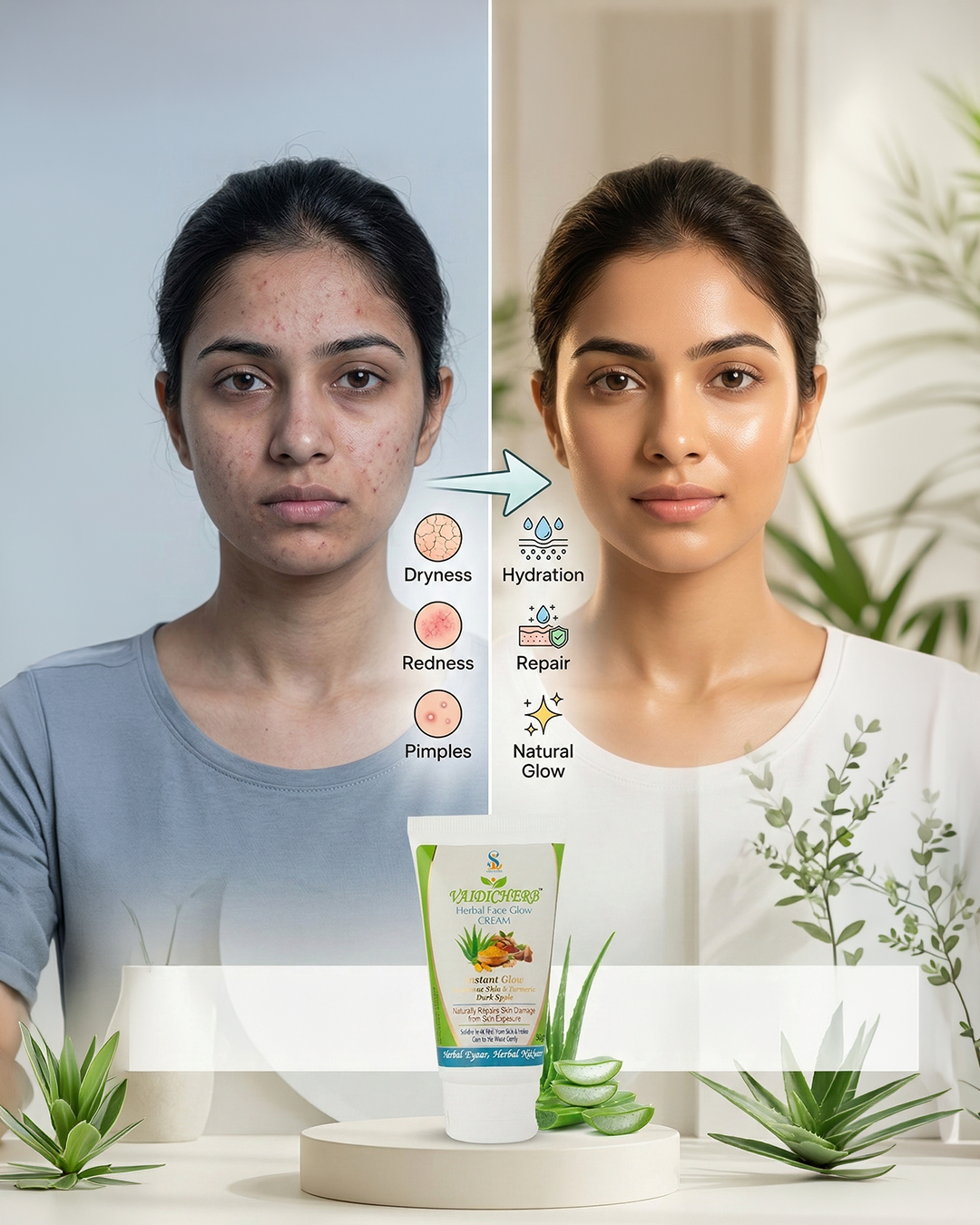 "Steroid creams और harsh chemical products से damage हुई skin में redness, sensitivity और dullness आम है। VaidicHerb Skin Repair Cream का herbal formula skin को hydrate करके repair और natural glow को support करने में मदद कर सकता है।"–